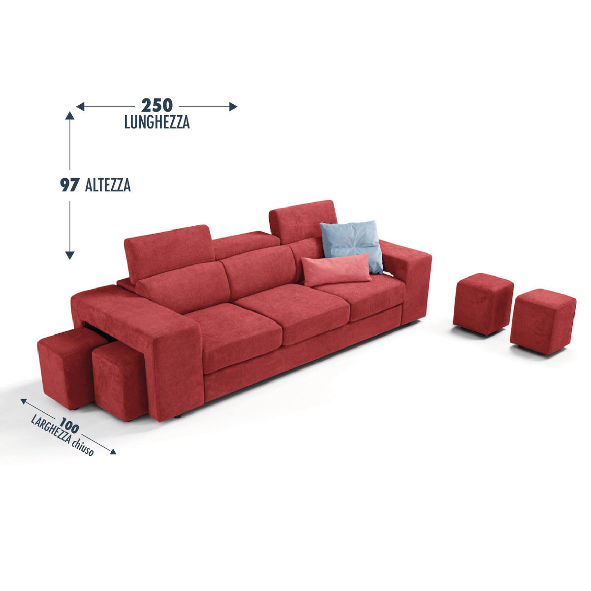 TALENTO di Komodo è il divano 3 posti dal design pulito e lineare con il miglior rapporto qualità-prezzo. È dotato di 3 poggiatesta regolabili manualmente studiati per il massimo comfort della zona cervicale e 4 pouf collocati nella sezione laterale del divano.