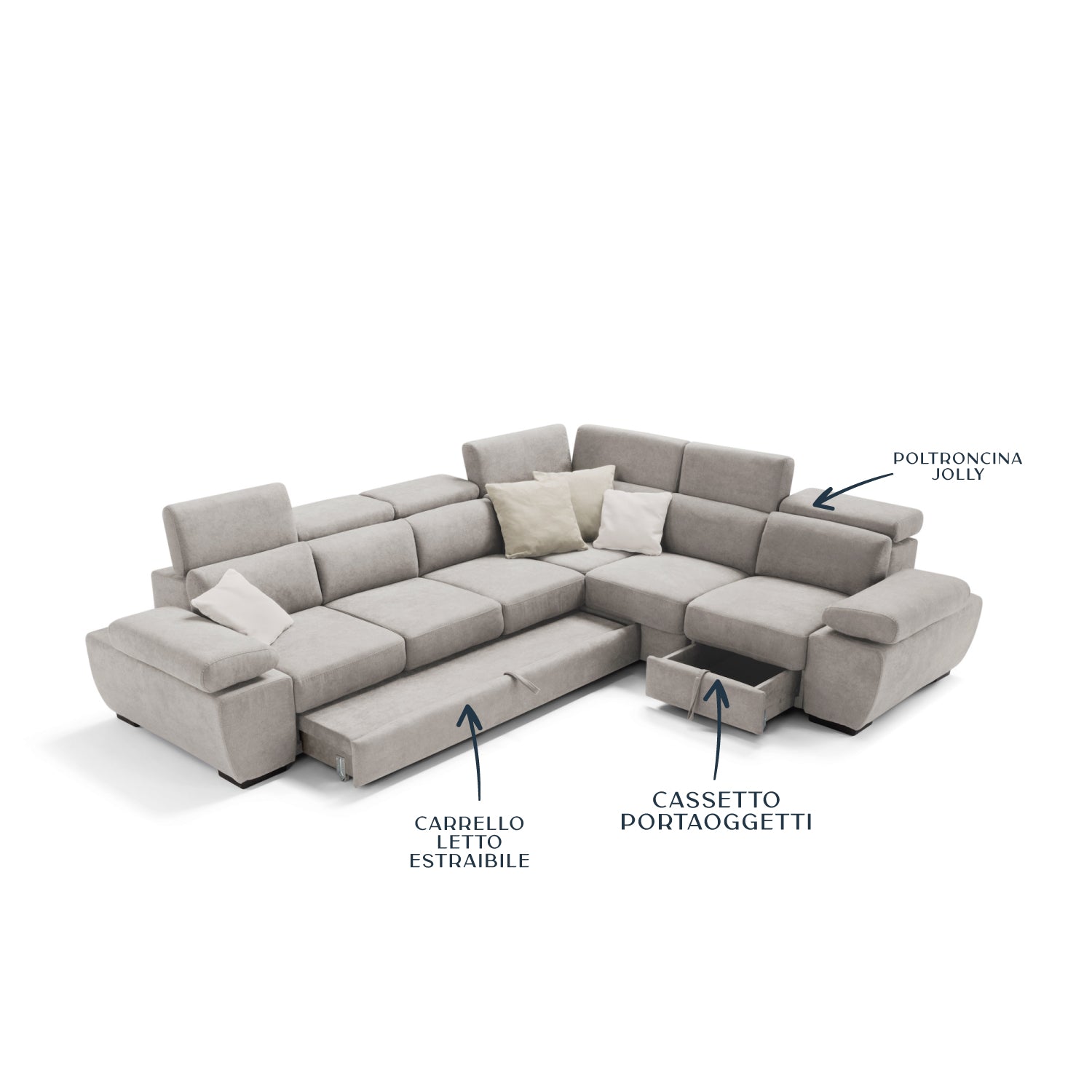 FABIOLA divano 3 posti max, angolo terminale e poltrona jolly con cassetto portaoggetti - apertura letto KOMODO