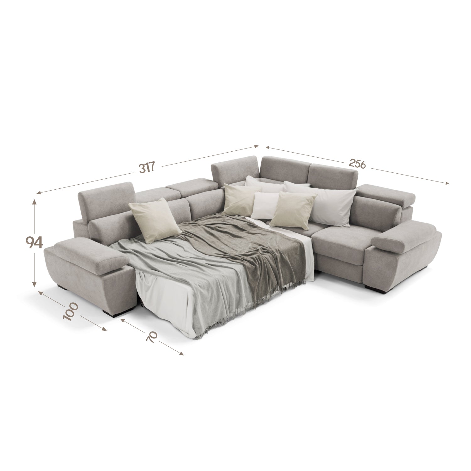 FABIOLA di Komodo è il divano angolare 3 posti max con il miglior rapporto qualità-prezzo. È dotato di 7 poggiatesta regolabili manualmente studiati per il massimo confort della zona cervicale. È dotato anche di 2 braccioli regolabili manualmente con sistema a cricchetto. La composizione è completata da un cassetto portaoggetti collocato sotto la poltrona jolly e di un carrello estraibile che lo trasforma in pochi secondi in un pratico letto.