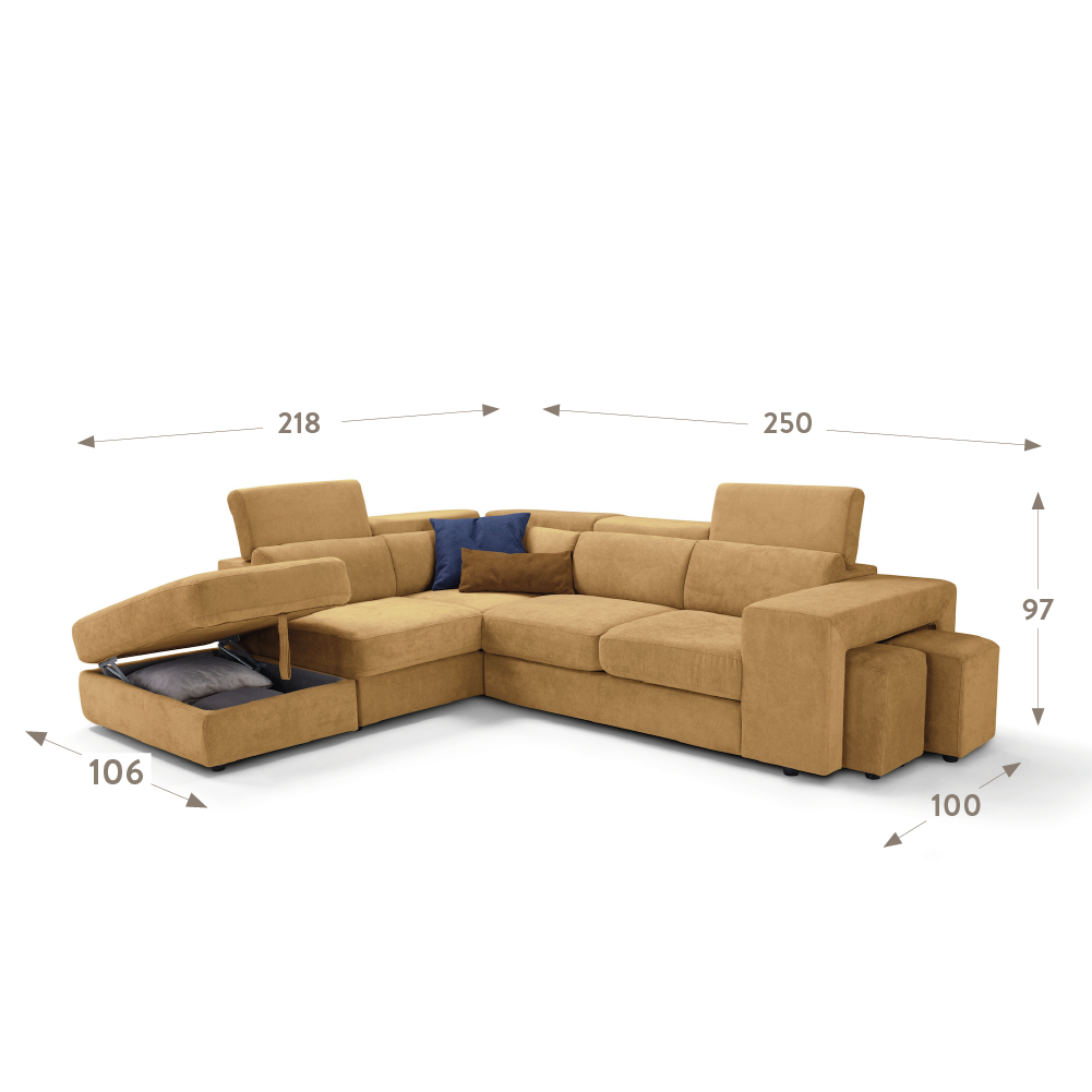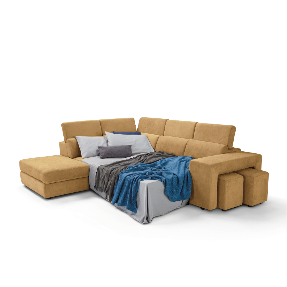 TALENTO di Komodo è il divano angolare con il miglior rapporto qualità-prezzo. È dotato di 5 poggiatesta regolabili manualmente studiati per il massimo confort della zona cervicale. I 2 pratici pouf collocati nella sezione laterale del divano gli donano un design contemporaneo, al contempo utili come sedute extra. Un pratico carrello estraibile lo trasforma in pochi secondi in un divano letto. La composizione è completata da un capiente pouf contenitore.