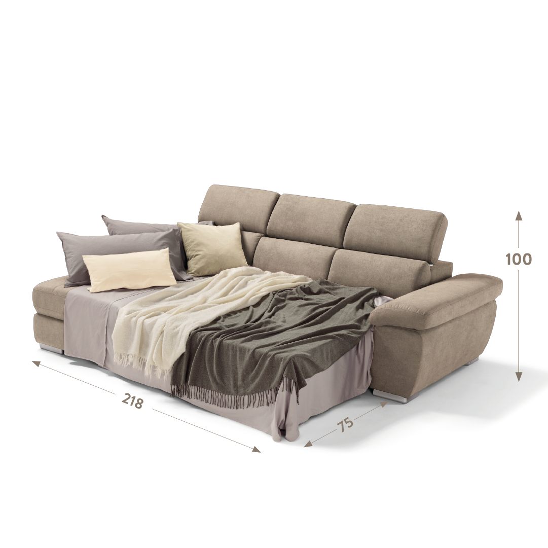 Alexa di Komodo è il divano che si adatta a qualsiasi tipologia di arredo. Le sue linee morbide e semplici garantiscono una comodità senza eguali. È dotato di 3 poggiatesta regolabili manualmente studiati per il massimo confort della zona cervicale e un carrello estraibile che lo trasforma in pochi secondi in un pratico letto. Il modello è completato da un pratica chaise longue con contenitore.