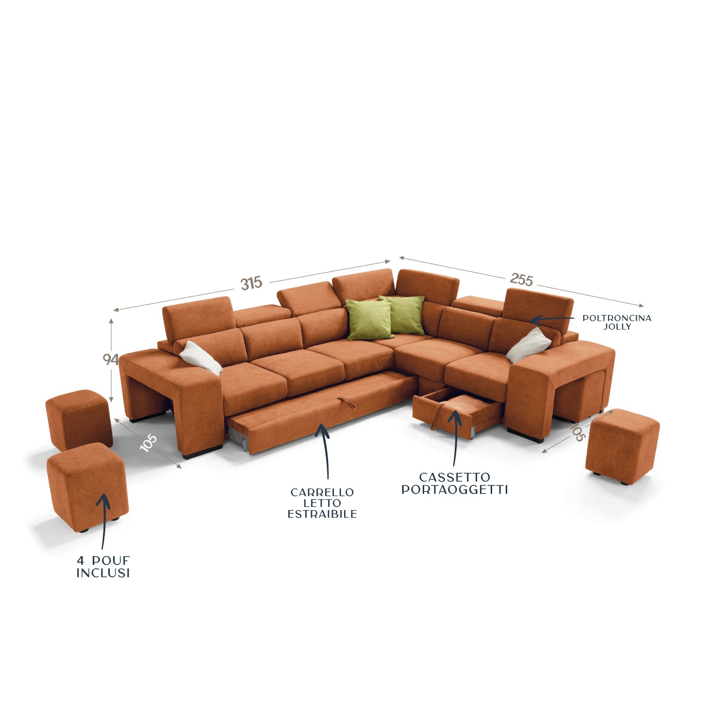 Con carrello letto estraibile, 4 pouf, poltroncina, vano portaoggetti