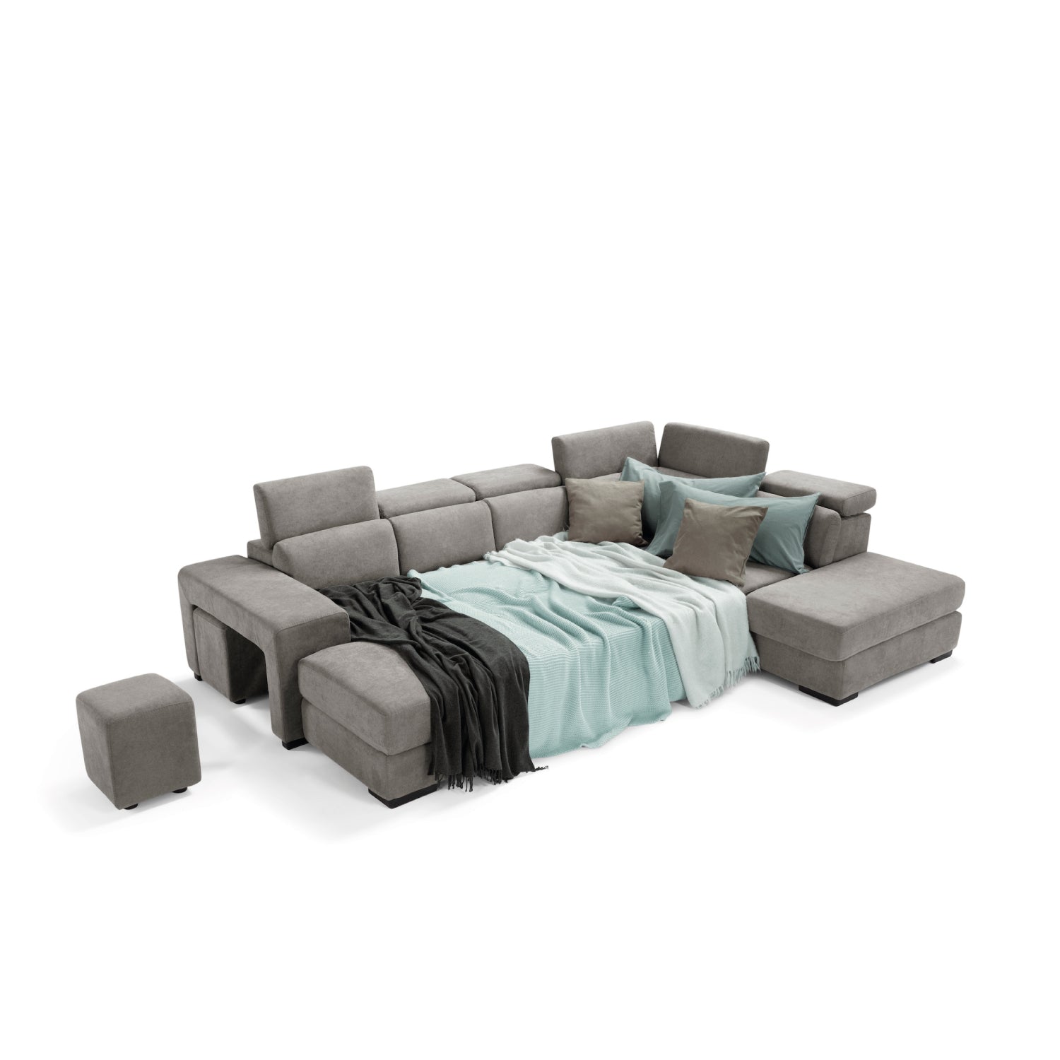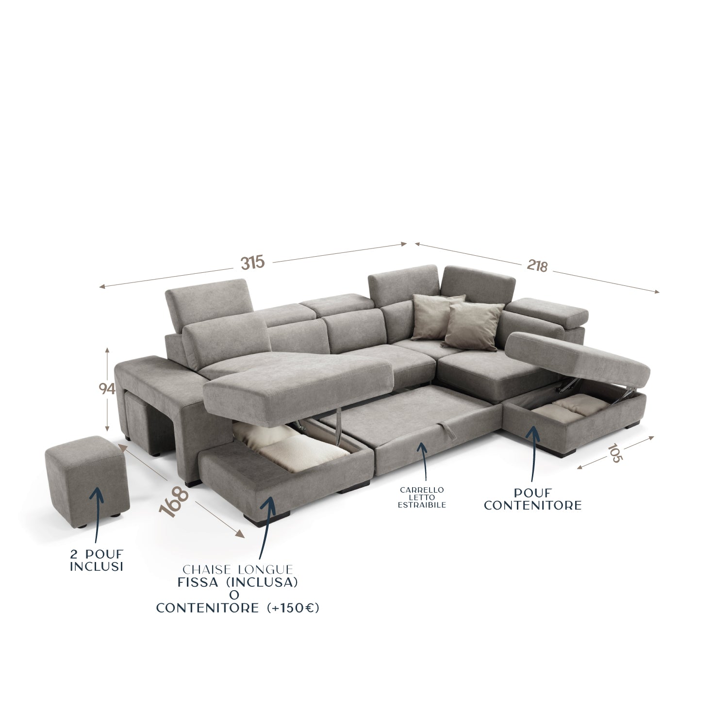 TALENTO divano chaise longue 2 posti con angolo terminale e pouf contenitore - apertura letto KOMODO